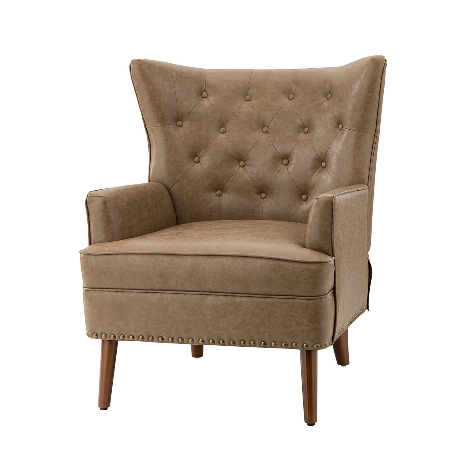 DetailThis armchair features nailhead trim and deep button tufting that adds classic glam style to your living room or den. This strong structure wrapped in comfortable, skin-touch friendly and soft vegan leather blended with vivid random colors hues elevates the feel of a minimalist aesthetic.